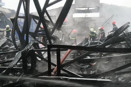 Lực lượng chữa cháy dập tắt đám cháy tại nhà kho Công ty cổ phần sơn Á Đông ngày 28-6. |