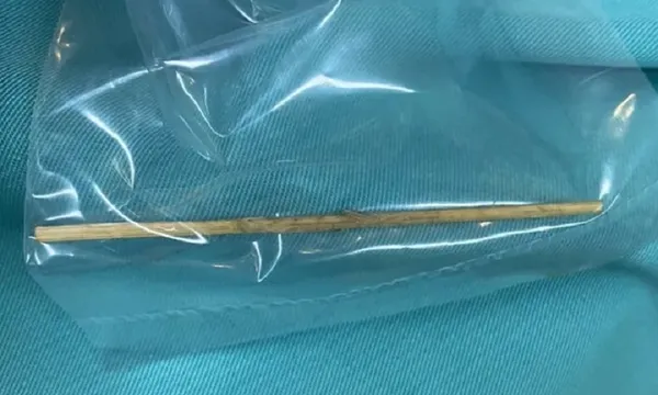 Sau khi phẫu thuật nội soi khẩn cấp, các bác sĩ lấy ra được một cây tăm xỉa răng. Theo người nhà, bé có thói quen ăn vội và không nhai kỹ, rất có thể đã nuốt tăm mà không hay biết.