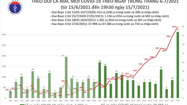 Trong ngày 15/7, Việt Nam ghi nhận 3.416 ca mắc mới: 37 ca cách ly ngay sau khi nhập cảnh tại Thanh Hóa (19), TP. Hồ Chí Minh (10), An Giang (2), Hà Nội (2), Ninh Bình (1), Bà Rịa - Vũng Tàu (1), Quảng Nam (1), Bình Định (1) và 3.379 ca ghi nhận trong nước tại TP. Hồ Chí Minh (2691), Đồng Nai (132), Bình Dương (122), Đồng Tháp (99), Phú Yên (48), Long An (41), Đà Nẵng (33), Bến Tre (30), Khánh Hòa (22), Hưng Yên (22), Hà Nội (18), Bà Rịa - Vũng Tàu (17), Ninh Thuận (17), Vĩnh Long (17), Bình Thuận (17), Bình Phước (13), Cần Thơ (11), An Giang (8 ), Sóc Trăng (4), Quảng Ngãi (4), Bắc Ninh (3), Trà Vinh (3), Đắk Nông (1), Bình Định (1), Cà Mau (1), Vĩnh Phúc (1), Lâm Đồng (1), Đắk Lắk (1), Bắc Giang (1); trong đó 3.099 ca được phát hiện trong khu cách ly hoặc khu đã được phong toả.