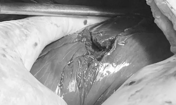 Nửa gan phải của bệnh nhân bị dập nát, nhiều đường vỡ đi khắp mặt và nhu mô gan, trong đó có 1 đường vỡ gây rách tĩnh mạch cửa phải (là một mạch máu rất lớn của gan) khiến máu chảy ồ ạt vào ổ bụng.