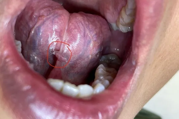Sau 2 tuần kể từ cuộc gặp, thanh niên bất ngờ xuất hiện tình trạng ngứa họng, cảm giác có vật gì rất vướng mỗi khi nhai nuốt thức ăn. Vị trí kẽ chân răng, dây hãm lưỡi mọc u nhú, ngày càng to, dễ chảy máu.