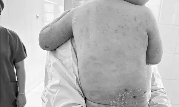 Bé B.P.T. (2 tuổi, tỉnh Gia Lai) nhập viện trong tình trạng nguy kịch với diện tích phỏng lên đến 60% cơ thể, bao gồm cổ, ngực, bụng, lưng, mông, hai tay và hai đùi.