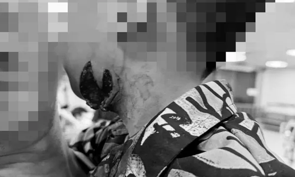 Con chó lao ra cắn nhiều nhát vào cổ, tay và đùi phải. Nặng nhất là vết rách vùng cổ rộng 3x5cm, chỉ cách hệ mạch cảnh 3cm - khu vực có thể đe dọa tính mạng nếu tổn thương lui xuống phía dưới 3cm.