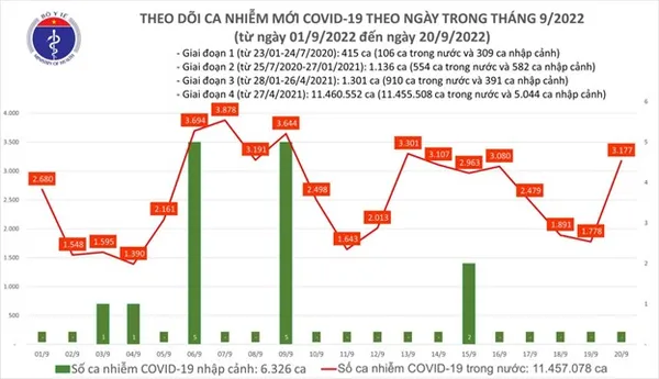 Ngày 20/9, Bộ Y tế cho biết, trong ngày cả nước có 3.177 ca nhiễm Covid-19 mới, tăng gần 1.400 ca so với hôm qua; có 1.434 bệnh nhân khỏi, 144 ca nặng đang thở oxy và 1 trường hợp F0 tại Cần Thơ tử vong.