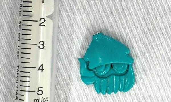 Khi soi các Bác sĩ thấy dị vật là con cá nhựa kích cỡ khoảng 2cm và có nhiều góc cạnh sắc nhọn dễ gây trầy xước.