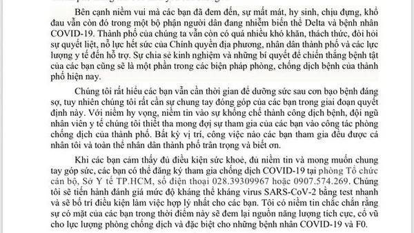 Mở đầu thư, Thứ trưởng Nguyễn Trường Sơn-Trưởng Bộ phận thường trực đặc biệt của Bộ Y tế để hỗ trợ chống chống dịch COVID-19 tại TPHCM-đã chúc mừng cán bộ nhân viên y tế trong cả nước đã dũng cảm chiến đấu, vượt qua bệnh tật để đem lại niềm vui cho gia đình, bạn bè, mang lại hạnh phúc cho đội ngũ nhân viên y tế và thắp sáng niềm tin cho sự chiến thắng đại dịch tại Thành phố mang tên Bác thân yêu.