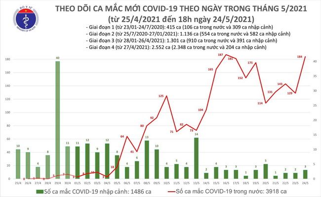 - Trong ngày 24/5, Việt Nam ghi nhận thêm 187 ca mắc mới: