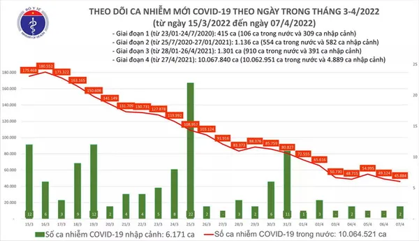 - Tính từ 16h ngày 06/4 đến 16h ngày 07/4, trên Hệ thống Quốc gia quản lý ca bệnh COVID-19 ghi nhận 45.886 ca nhiễm mới, trong đó 2 ca nhập cảnh và 45.884 ca ghi nhận trong nước (giảm 3.240 ca so với ngày trước đó) tại 63 tỉnh, thành phố (có 33.715 ca trong cộng đồng).