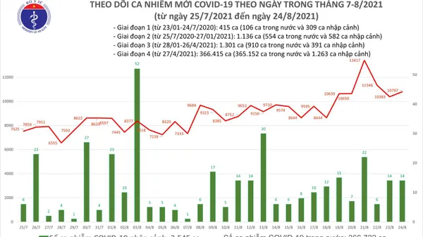 Tính từ 18h30 ngày 23/8 đến 18h00 ngày 24/8, trên Hệ thống Quốc gia quản lý ca bệnh Covid-19 ghi nhận 10.811 ca nhiễm mới, trong đó 14 ca nhập cảnh và 10.797 ca ghi nhận trong nước tại TPHCM (4.627), Bình Dương (3.628), Đồng Nai (799), Long An (393), Khánh Hòa (203), Đồng Tháp (162), Đà Nẵng (153), Tây Ninh (105), Tiền Giang (93), Cần Thơ (72), Hà Nội (66), Bà Rịa - Vũng Tàu (64), Kiên Giang (61), Bình Thuận (56), Sóc Trăng (42), An Giang (42), Nghệ An (28), Phú Yên (24), Đắk Lắk (21), Bình Phước (20), Thừa Thiên Huế (13), Bến Tre (12), Vĩnh Long (11), Quảng Nam (11), Hà Tĩnh (10), Hậu Giang (9), Quảng Trị (9), Sơn La (9), Bạc Liêu (7), Lạng Sơn (7), Trà Vinh (6), Thanh Hóa (5), Lâm Đồng (5), Bình Định (5), Ninh Thuận (4), Gia Lai (3), Bắc Ninh (3), Bắc Giang (3), Quảng Bình (2), Quảng Ngãi (1), Hà Nam (1), Hải Phòng (1), Cà Mau (1) trong đó có 6.780 ca trong cộng đồng.