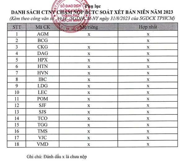 Tuy nhiên, đến hết thời hạn nộp báo cáo, Sở Giao dịch Chứng khoán TPHCM vẫn chưa nhận được BCTC soát bán niên năm 2023 của 18 Công ty trên.