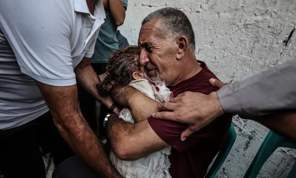 Một người đàn ông ôm chặt thi thể của bé Mila hai tuổi. Cô bé cùng em trai Mohammed thiệt mạng trong một cuộc tấn công của Israel vào trại tị nạn Nuseirat ở Deir al-Balah vào tháng 8/2024 - Ảnh: Getty Images