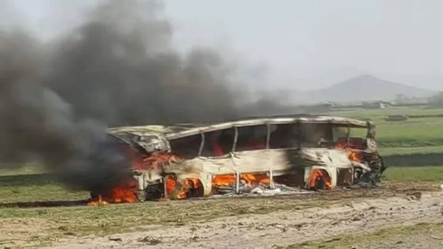 Chiếc xe buýt bốc cháy dữ dội sau va chạm. Ảnh BBC.