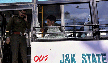 Hiện trường đầy mảnh vỡ của kính xe buýt trong vụ nổ lựu đạn tại thành phố Jammu, Ấn Độ ngày 07/03/2019 (Ảnh: New Strait Times)