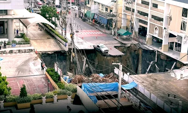 Ngày 24/9, sự cố sụt lún nghiêm trọng xảy ra trên tuyến đường Samsen, thủ đô Bangkok (Thái Lan), gây hư hỏng nặng và ảnh hưởng lớn đến đời sống người dân. Vụ việc được xác định liên quan công trình xây dựng hầm kết nối tuyến metro, khi vết nứt trên hầm khiến đất trượt xuống khoảng trống, làm vỡ ống nước đường kính 1,5m và gây mất nước diện rộng.