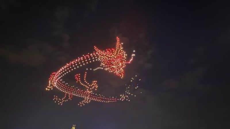 Máy bay không người lái tạo thành các hình ảnh như Công viên Đại dương, đường chân trời của cảng Victoria, bảng hiệu đèn neon, vũ công opera Quảng Đông, rồng bay trên bầu trời đêm trên cảng Victoria.