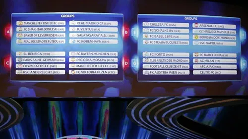 Sociedad Bảng B: Real Madrid, Juventus, Galatasaray, FC Copenhagen Bảng C: Benfica, Paris St Germain, Olympiakos Piraeus, Anderlecht Bảng D: Bayern Munich, CSKA Moscow, Manchester City, Viktoria Plzen Bảng E: Chelsea, Schalke 04, Basel, Steaua Bucharest Bảng F: Arsenal, Olympique Marseille, Borussia Dortmund, Napoli Bảng G: Porto, Atletico Madrid, Zenit St Petersburg, Austria Vienna Bảng H: Barcelona, AC Milan, Ajax Amsterdam, Celtic |