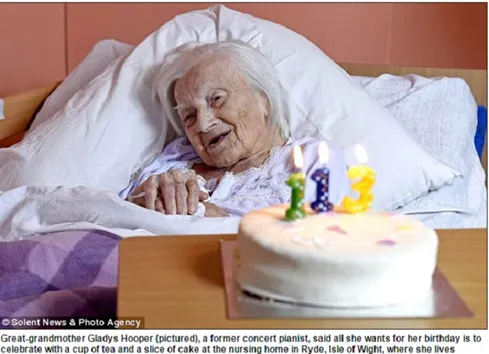 Thời trẻ, cụ Gladys Hooper từng là một nghệ sĩ piano tài năng. Bà sinh ngày 18/1/1903, trong dịp kỷ niệm sinh nhật lần thứ 113 của mình vào đầu năm nay, cụ đã ví von mình “tựa như mới 75 tuổi”. Cụ tiết lộ bí quyết sống thọ của mình là nhờ chế độ ăn hợp lý, thỉnh thoảng uống rượu sherry....