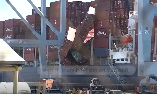 Các container rơi từ con tàu Mississippi dài 255 m treo cờ Bồ Đào Nha khi tàu đang neo đậu tại bến container Pier G.