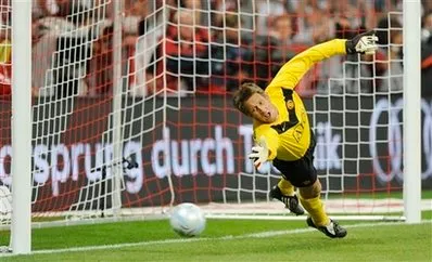 Edwin van der Sar tung người chặn cú sút 11 mét của cầu thủ Bayern Munich.