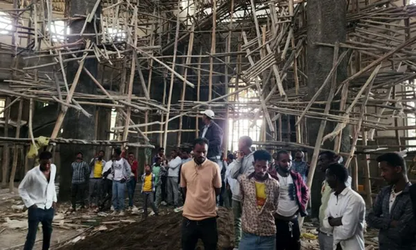 Bên trong Nhà thờ Menjar Shenkora Arerti Mariam đang được xây dựng đã bị sập ở Arerti, vùng Amhara phía bắc Ethiopia, vào ngày 1/10/2025 - Ảnh: AP