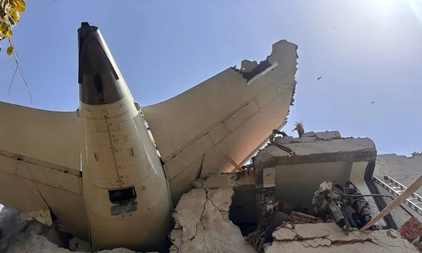 Hình ảnh hiện trường cho thấy phần đuôi máy bay bị mắc kẹt trên mái một tòa nhà, trong khi phần thân chính vỡ nát, bốc cháy dữ dội.