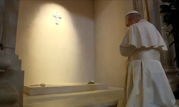 Giáo hoàng Leo XIV bước vào Vương cung Thánh đường Đức Bà Cả trong tiếng hô vang "Viva il papa" (Giáo hoàng muôn năm) và bước chậm rãi tới mộ của người tiền nhiệm. Ông đặt bông hoa trắng lên bia đá, sau đó quỳ trước mộ và cầu nguyện trong vài phút.