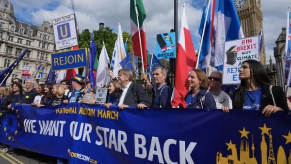 Ngày 23/9, cuộc Tuần hành Tái hợp Toàn quốc ở Anh thu hút khoảng 3.000 người tham gia biểu tình vẫy cờ các nước EU dọc tuyến đường Park Lane, di chuyển hướng về phía Quảng trường Quốc hội để nghe phát biểu.