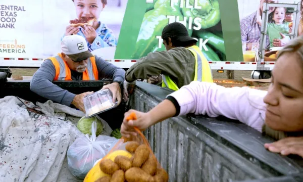 Tại Houston, hàng ngàn người xếp hàng trước sân vận động NRG để nhận trái cây và thực phẩm khô do Ngân hàng Thực phẩm Houston phân phát.