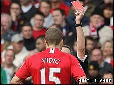 Vidic bị trọng tài Alan Wiley phạt thẻ đỏ sau pha phạm lỗi với Gerrard.