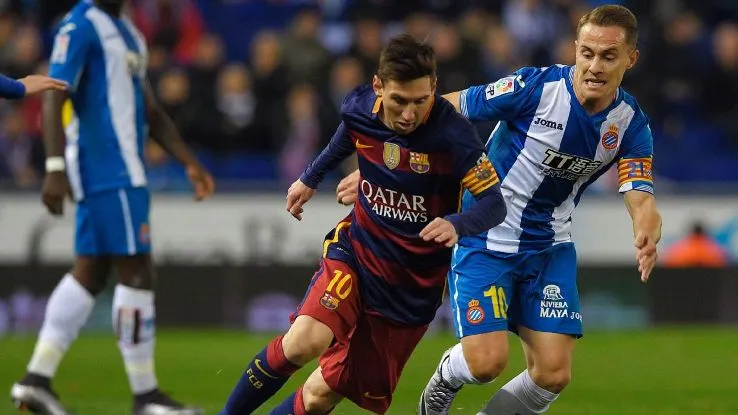 Messi đi bóng trước sự áp sát của cầu thủ Espanyol.