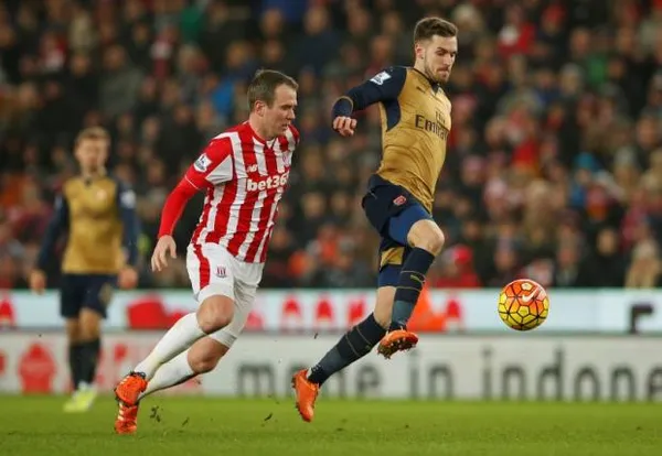Tiền vệ Ramsey của Arsenal bị cầu thủ Stoke City khóa chặt. Ảnh: Reuters
