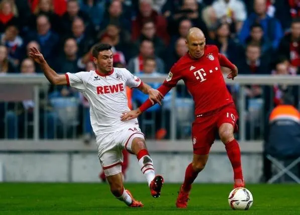 Robben đi bóng trước sự truy cản của cầu thủ Cologne Jonas Hector. Ảnh: Reuters