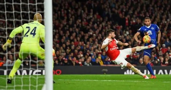 Tiền đạo Giroud tung người sút vô lê trong trận Arsenal - Everton. Ảnh: Reuters