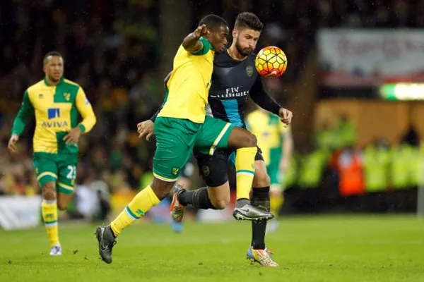 Tiền đạo Olivier Giroud (đen) tranh chấp bóng cùng cầu thủ Norwich City. Ảnh: Reuters