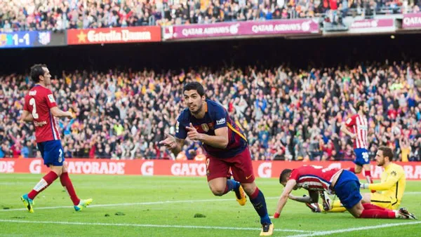 Suarez ăn mừng bàn thắng ghi vào lưới Atletico Madrid.