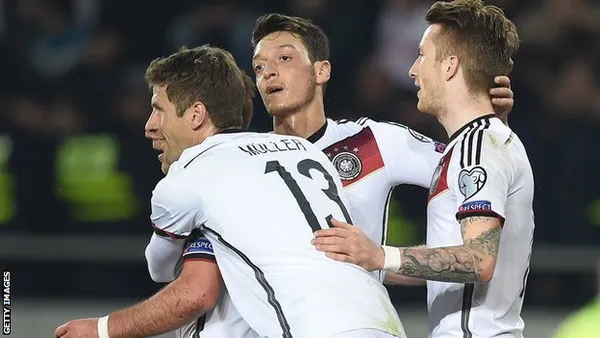 Các cầu thủ Đức ăn mừng bàn thắng vào lưới Georgia ở lượt trận cuối cùng.