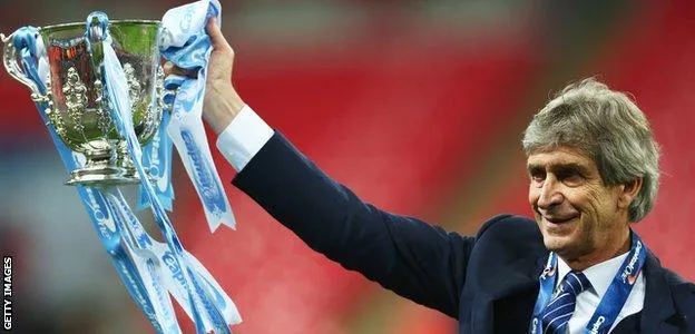 HLV Manuel Pellegrini của Man City giơ cao chiếc cúp vô địch League Cup.