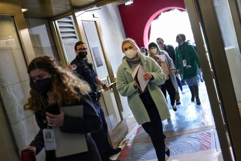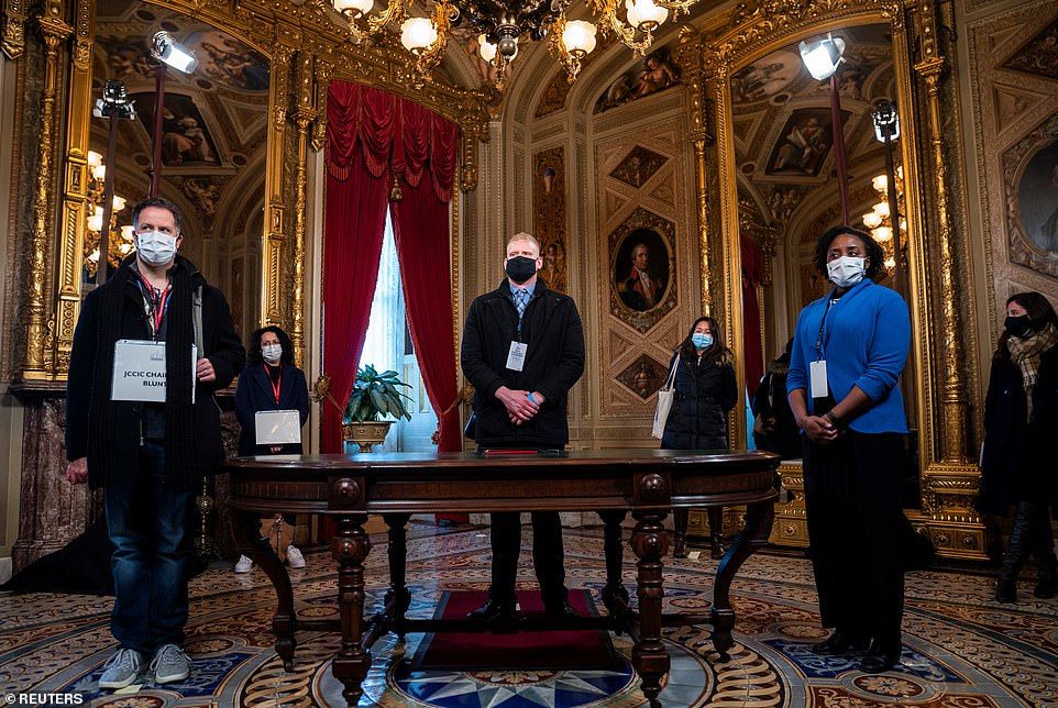 Các nhân viên đóng thế Tổng thống đắc cử Joe Biden, Phó Tổng thống đắc cử Kamala Harris đang tập trung bên trong Điện Capitol trong buổi tổng duyệt. Ảnh: Reuters