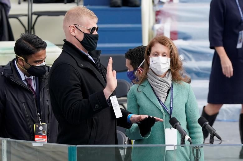 Hai nhân viên đóng thế đang diễn tập cảnh Tổng thống đắc cử Mỹ Joe Biden tuyên thệ nhậm chức, bên cạnh phu nhân Jill Biden trong buổi tổng duyệt tại Điện Capitol ở thủ đô Washington ngày 18/1/2021. Ảnh: Reuters