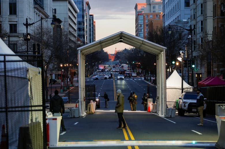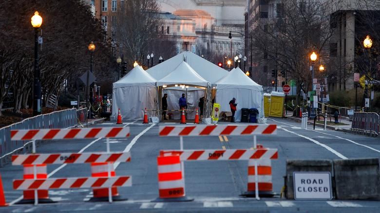 An ninh được thắt chặt tại khu vực Công viên quốc gia National Mall ở thủ đô Washington trước Điện Capitol. Năm nay, các hoạt động chào mừng lễ nhậm chức của Tổng thống đắc cử Joe Biden phần lớn được tổ chức trực tuyến, tuy vậy, ông Biden vẫn có kế hoạch tuyên thệ và đọc diễn văn nhậm chức tại Đồi Capitol vào ngày 20/1/2021. Ảnh: Reuters