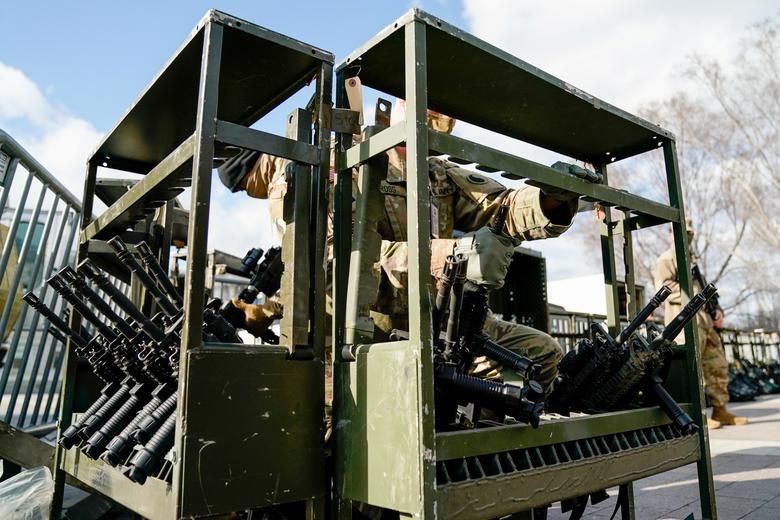 Vũ khí trang bị cho Lực lượng Vệ binh quốc gia Mỹ thực hiện nhiệm vụ tại buổi lễ tuyên thệ. Theo đó, các binh sĩ được trao quyền nổ súng và bắt giữ, tuần tra 24/24h khu vực Tòa nhà Quốc hội. Ảnh: Reuters