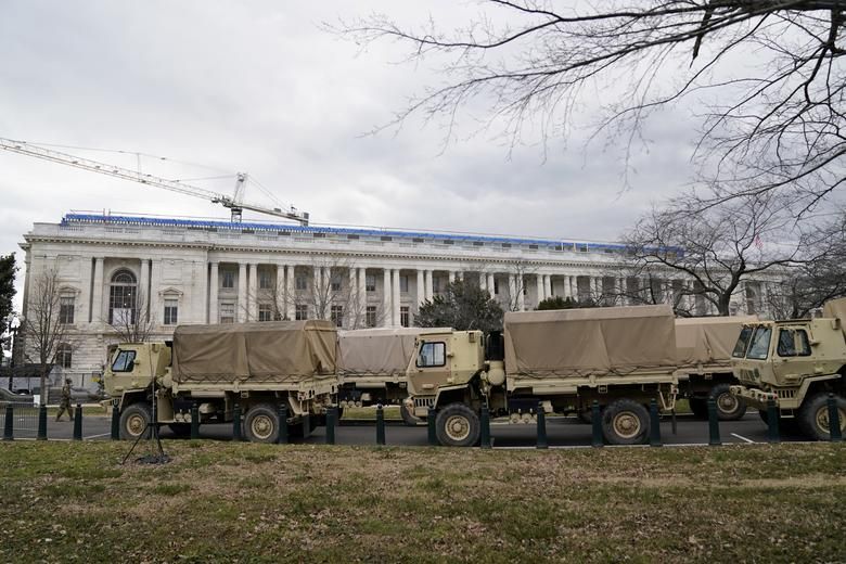 Xe quân đội tập trung trước Văn phòng Chính phủ liên bang ở thủ đô Washington trước nguy cơ có thể xảy ra bạo động trong ngày diễn ra lễ tuyên thệ nhậm chức Tổng thống Mỹ. Ảnh: Reuters