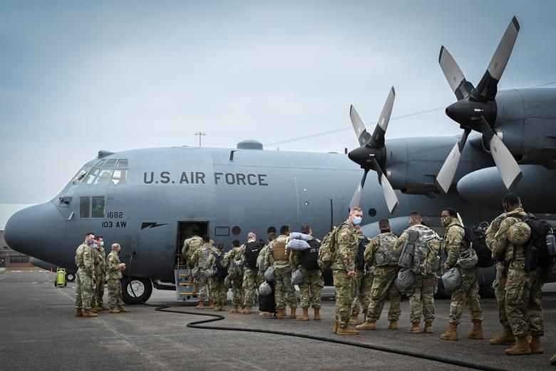 Binh lính Lực lượng Vệ binh quốc gia Mỹ từ Puerto Rico đang trên đường đến Washington thực hiện nhiệm vụ. Ảnh: Reuters