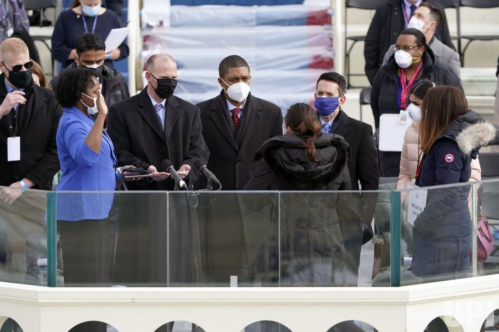 Hai nhân viên đóng thế Phó Tổng thống đắc cử Mỹ Kamala Harris và chồng là Doug Emhoff tuyên thệ nhậm chức trong buổi tổng duyệt tại Điện Capitol. Ảnh: Reuters