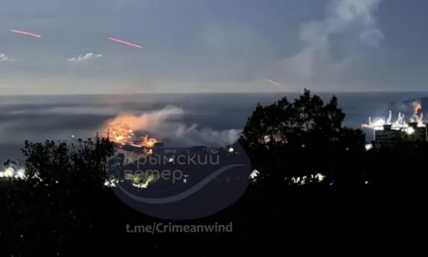Các đoạn video trên kênh tin tức Telegram của Nga và Ukraine cho thấy một tòa nhà và một tàu chở dầu bốc cháy vào ban đêm, theo Reuters.