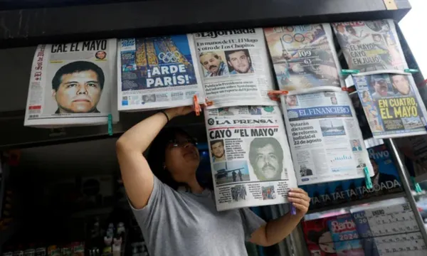 Người bán báo ở Mexico sắp xếp các tờ báo đưa tin về vụ bắt giữ trùm ma túy người Mexico Ismael "El Mayo" Zambada - Ảnh: REUTERS