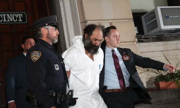 Anh ta cúi đầu bước đi và không trả lời các câu hỏi của phóng viên khi bị dẫn ra khỏi Đồn cảnh sát số 10 của Manhattan trong bộ đồ liền quần màu trắng, còng tay và cùm chân.