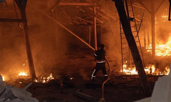 Lính cứu hỏa Ukraine dập lửa sau trận tập kích của Nga - Ảnh DSNS Ukraine