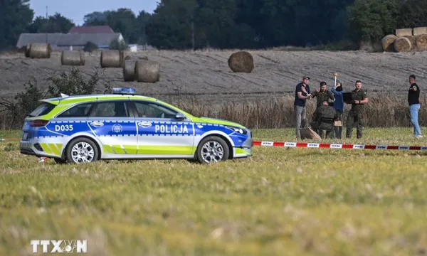 Hiện trường vụ thiết bị bay không người lái bị bắn rơi tại Wohyn, Ba Lan, ngày 10/9/2025 - Ảnh: PAP/TTXVN