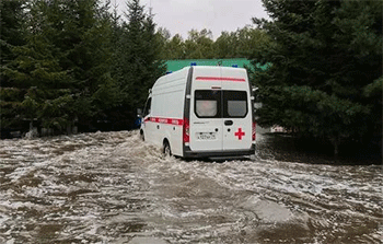 Xe cứu thương đi vào khu vực bị ngập sau vụ vỡ đập tại Nga. Ảnh: TASS.